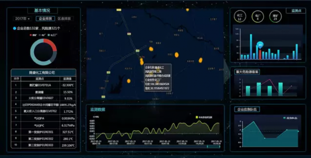 顯示接入的企業(yè)數(shù),設(shè)備數(shù)和監(jiān)測(cè)點(diǎn)位數(shù),治污設(shè)備的當(dāng)前運(yùn)行狀況和停產(chǎn)限產(chǎn)的異常狀況等信息。